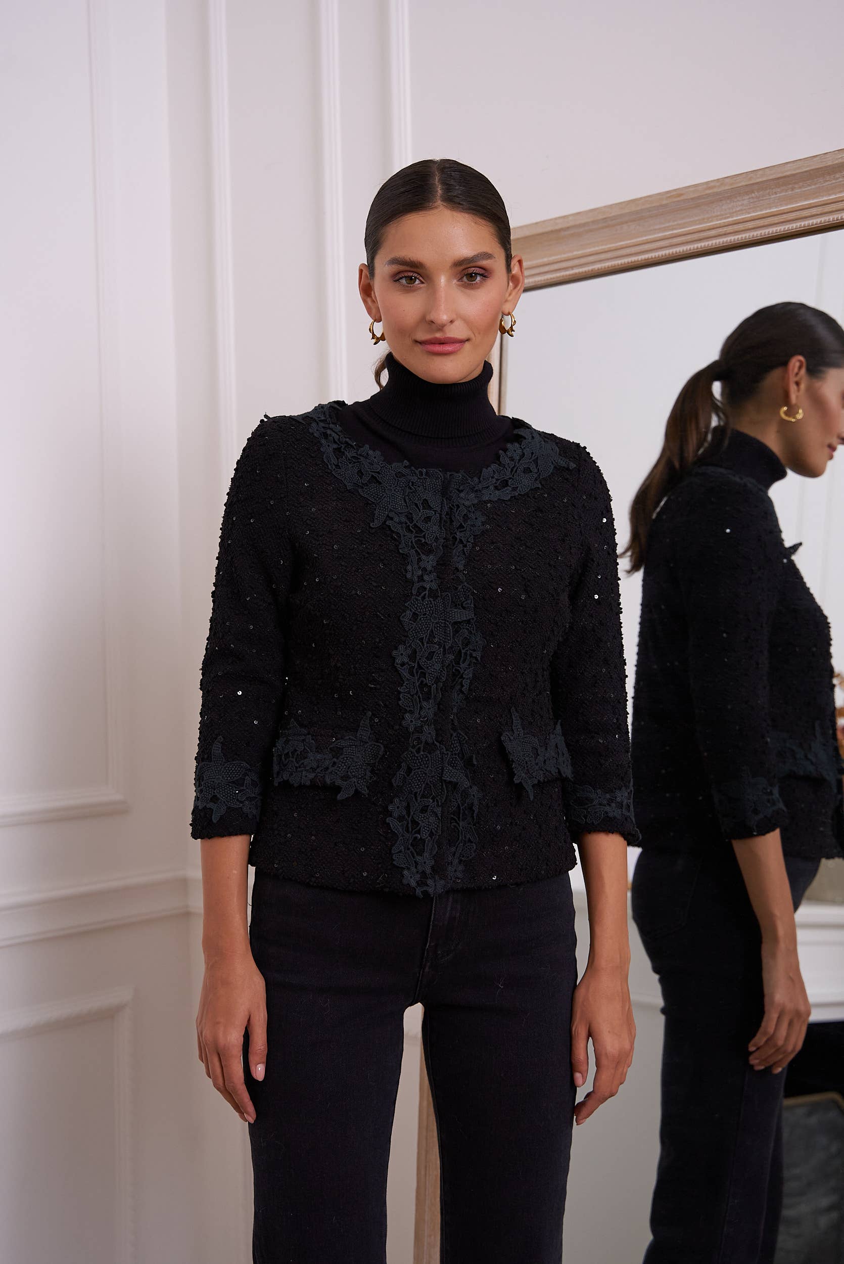 Sophisticated and feminine with a touch of cheeky, we love this short tweed jacket with lace trim on the collar and two front pockets, buttons at the front and three-quarter sleeves. Works just as well at the office as a social gathering.