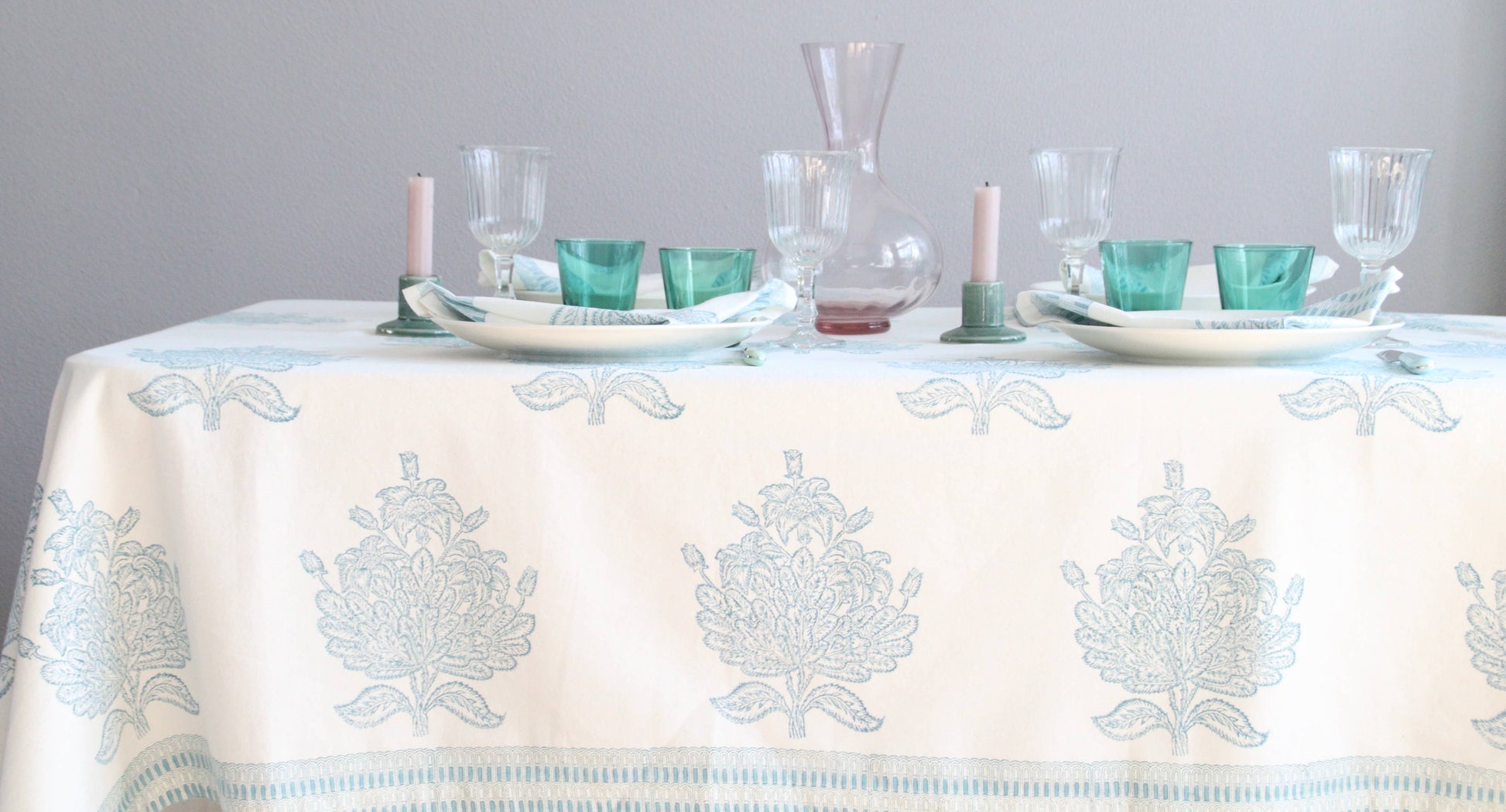 Add style and charm to your dining space with this gorgeous handprinted tablecloth. It’s perfect for everyday use or special occasions. It's made from thick, high-quality 100% cotton, handcrafted with unique blockprint details and has a striped border. Wash at 30°C to maintain its beauty.